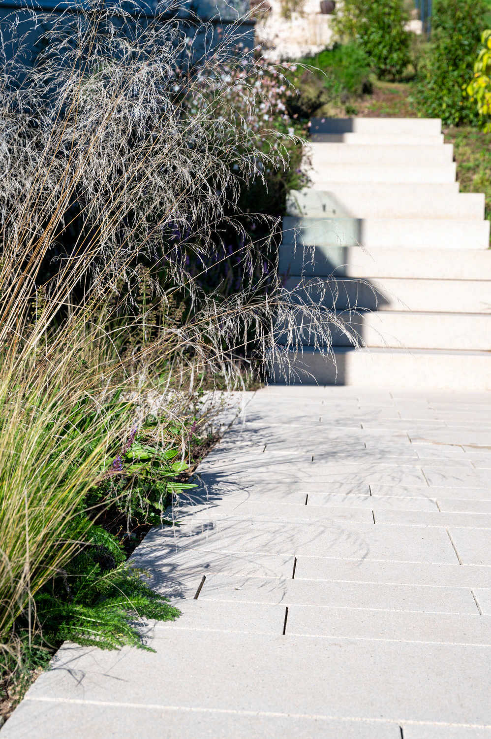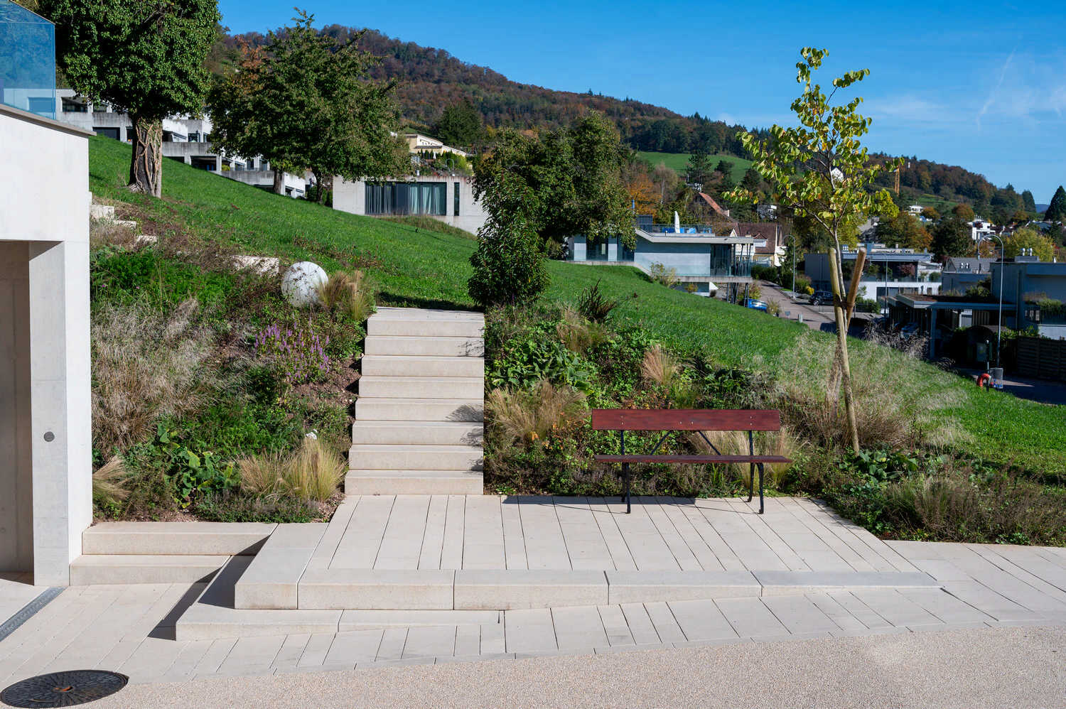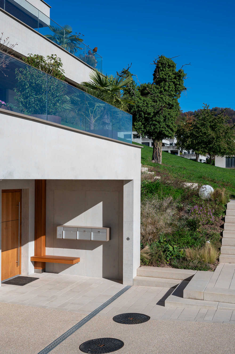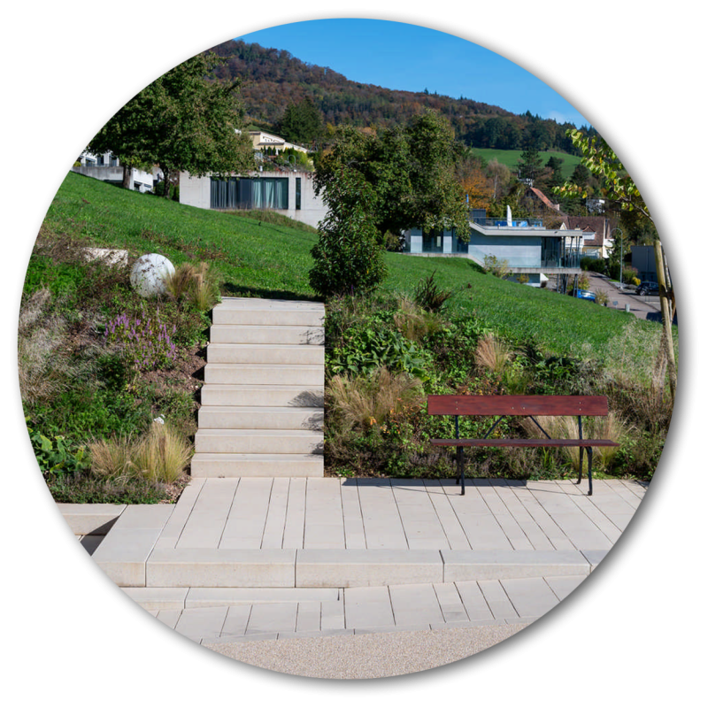 Hochwertige, helle Pflastersteine und Betonstufen, eingebunden in eine üppige Staudenbepflanzung, sorgen bei diesem Terrassenhaus für einen einladenden Ankunftsbereich. Auf den Terrassen entstanden zudem im Zusammenspiel zwischen Travertin-Bodenplatten, Kiesplätzen, Natursteinmauern und Bepflanzungen grosszügige Aussenflächen, welche den hochwertigen Wohnraum nach Aussen erweitern.