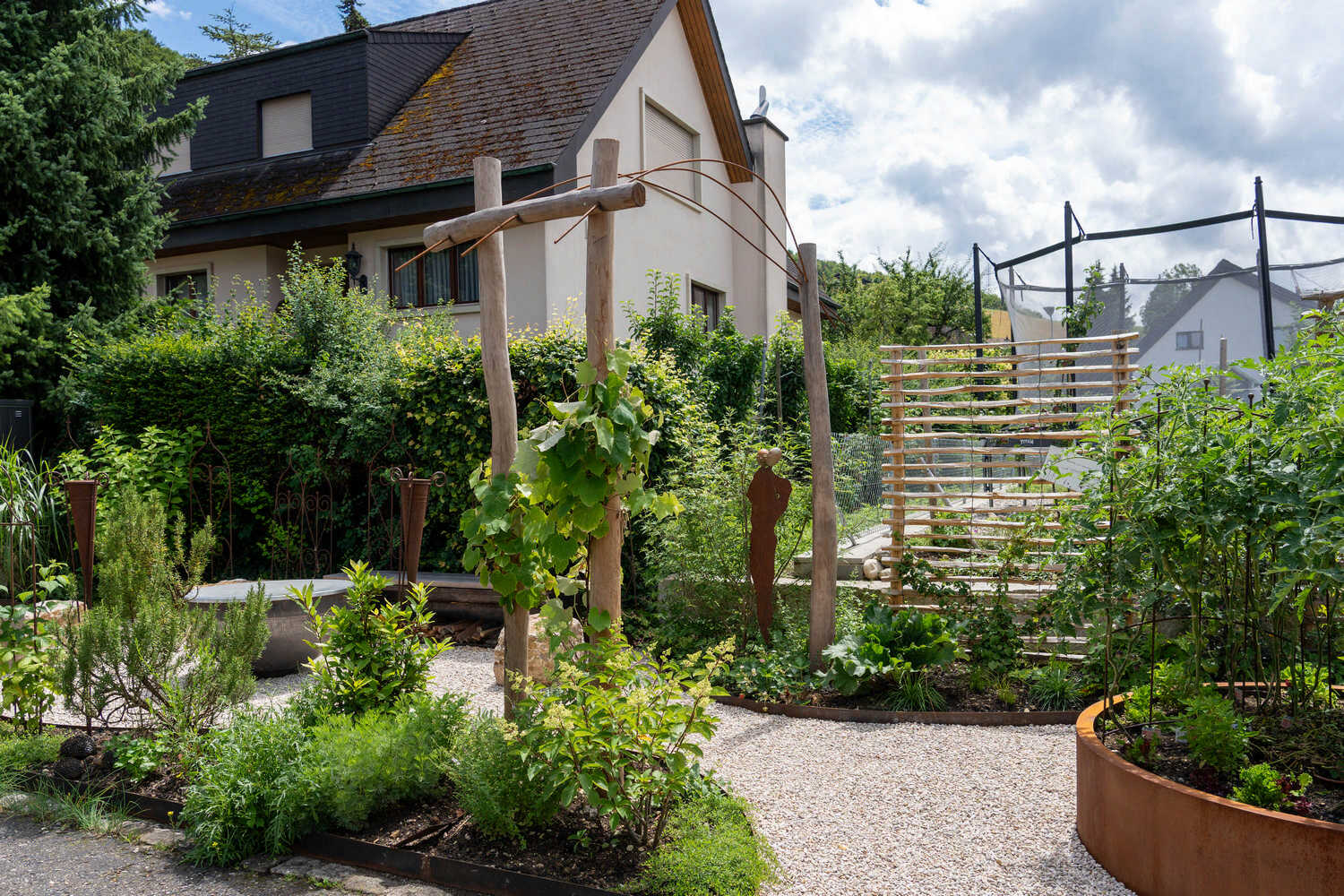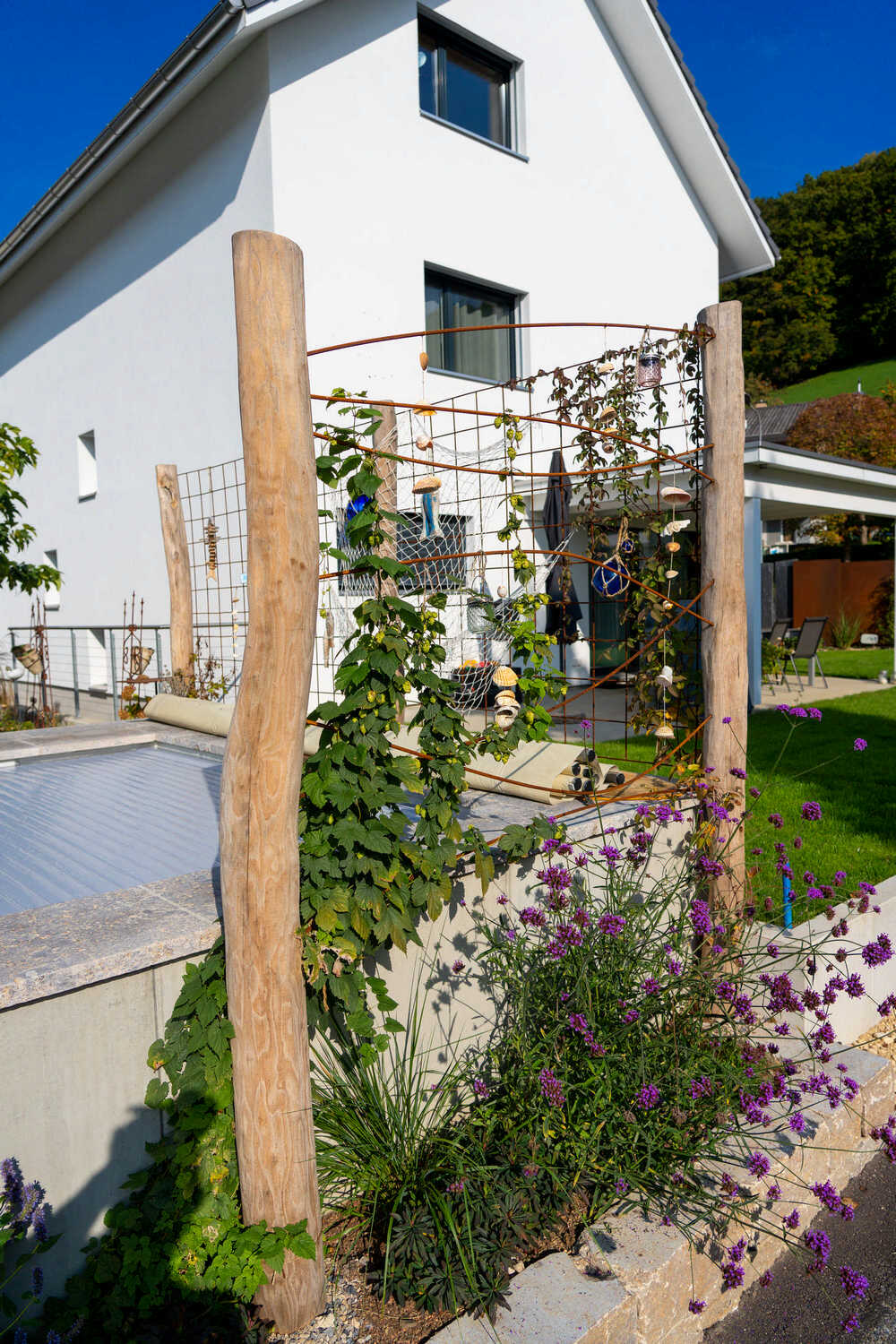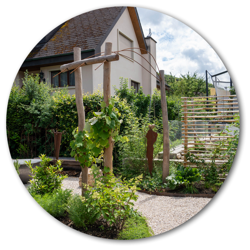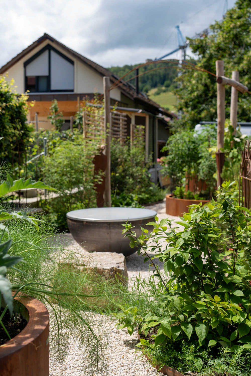 Auf kleinem Raum haben wir hier einen Pool mit angrenzendem Holzdeck realisiert – ein neuer Familientreffpunkt ist entstanden. Abgestützt mit einer Natursteinmauer aus Muschelkalkstein sowie geschwungenen Stahlbändern fasst eine artenreiche Bepflanzung mit Kräutern, Gräsern und (unter anderem) essbaren Wildstauden den neuen Sitzplatz ein. Auch der alte Gemüsegarten wurde in eine pflegeleichtere Lösung umgewandelt: Die grosszügige Kiesfläche, eingefasst durch eine farbenfrohe Staudenbepflanzung, umspielt die neuen Hochbeete sowie die Feuerschale mit den Sitzsteinen. Holzakzente wie die begrünten Naturzaunelemente oder der wilde Bogen für die neue Rebe sorgen für eine wohlige Wärme.
