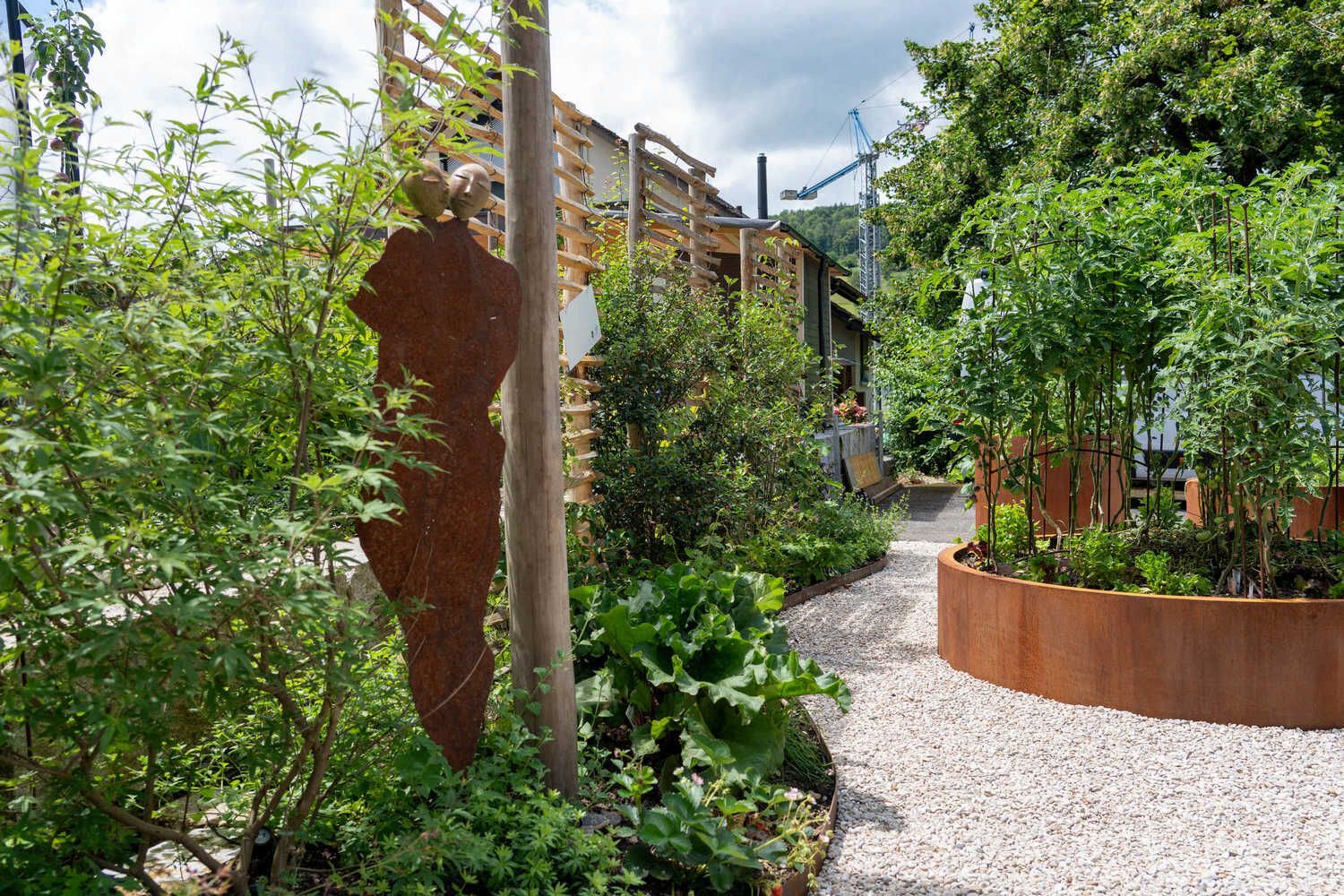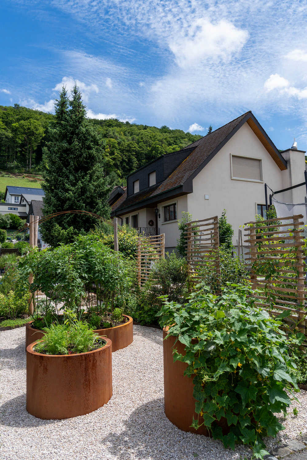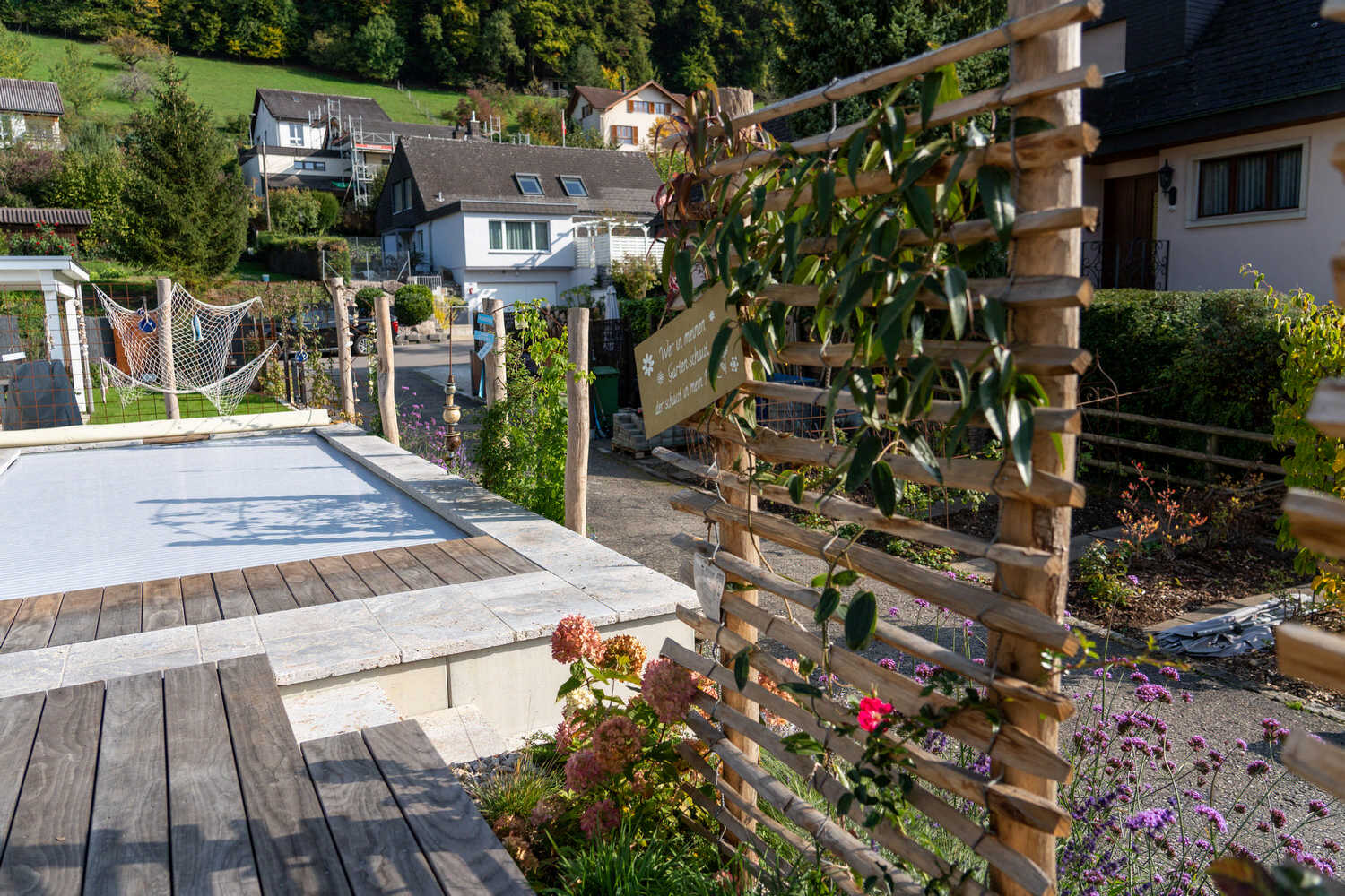 Auf kleinem Raum haben wir hier einen Pool mit angrenzendem Holzdeck realisiert – ein neuer Familientreffpunkt ist entstanden. Abgestützt mit einer Natursteinmauer aus Muschelkalkstein sowie geschwungenen Stahlbändern fasst eine artenreiche Bepflanzung mit Kräutern, Gräsern und (unter anderem) essbaren Wildstauden den neuen Sitzplatz ein. Auch der alte Gemüsegarten wurde in eine pflegeleichtere Lösung umgewandelt: Die grosszügige Kiesfläche, eingefasst durch eine farbenfrohe Staudenbepflanzung, umspielt die neuen Hochbeete sowie die Feuerschale mit den Sitzsteinen. Holzakzente wie die begrünten Naturzaunelemente oder der wilde Bogen für die neue Rebe sorgen für eine wohlige Wärme.
