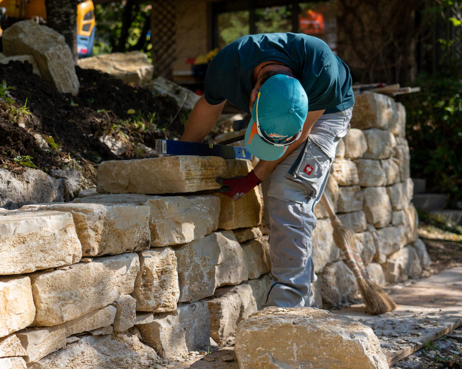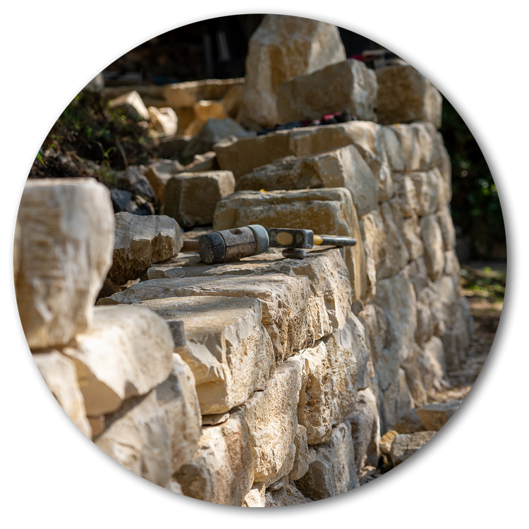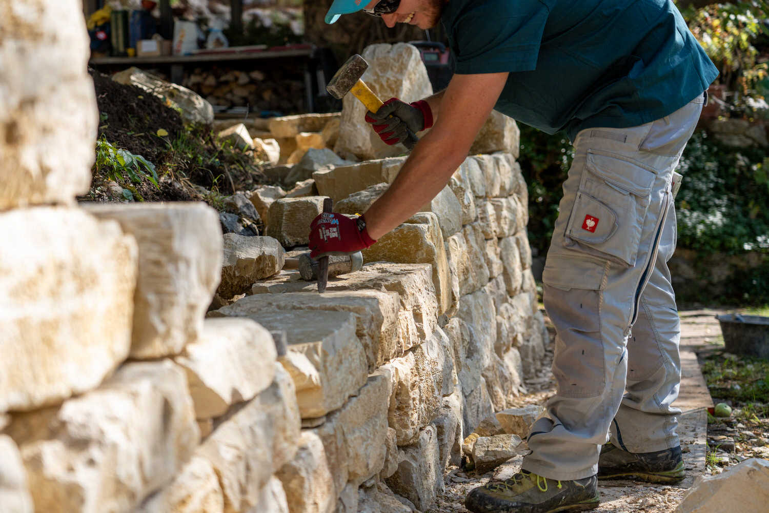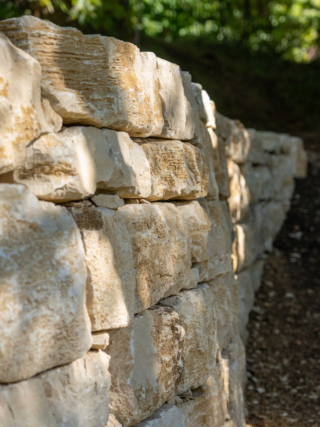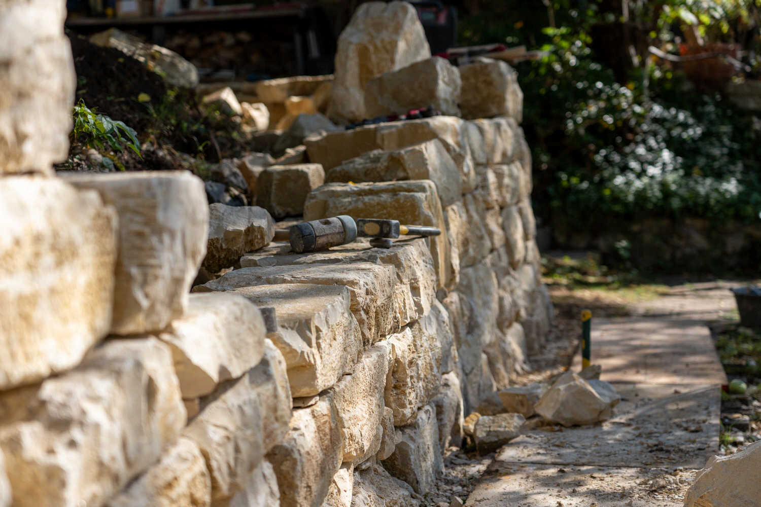 Kalkstein-Trockenmauer in naturnahem Garten