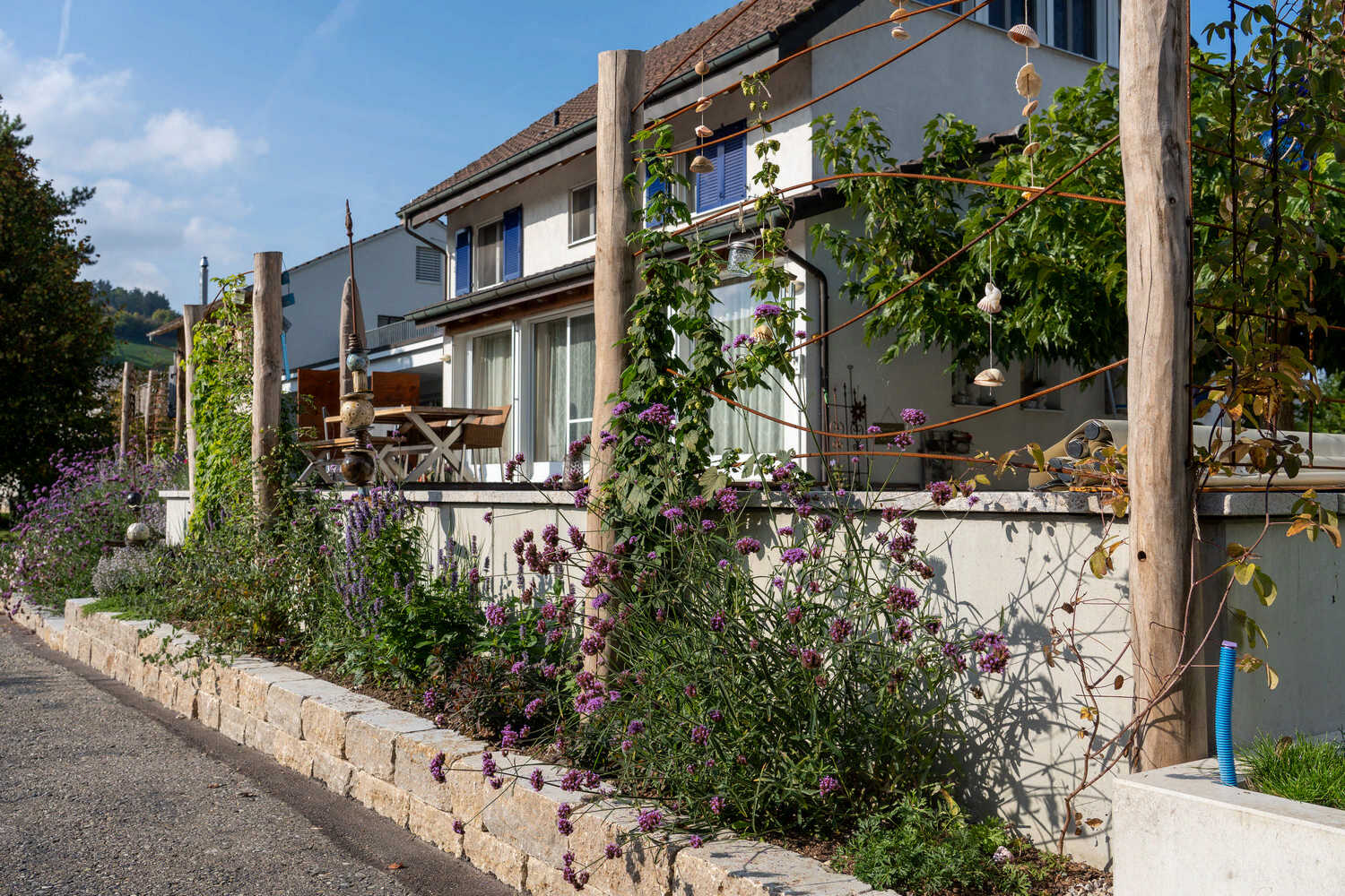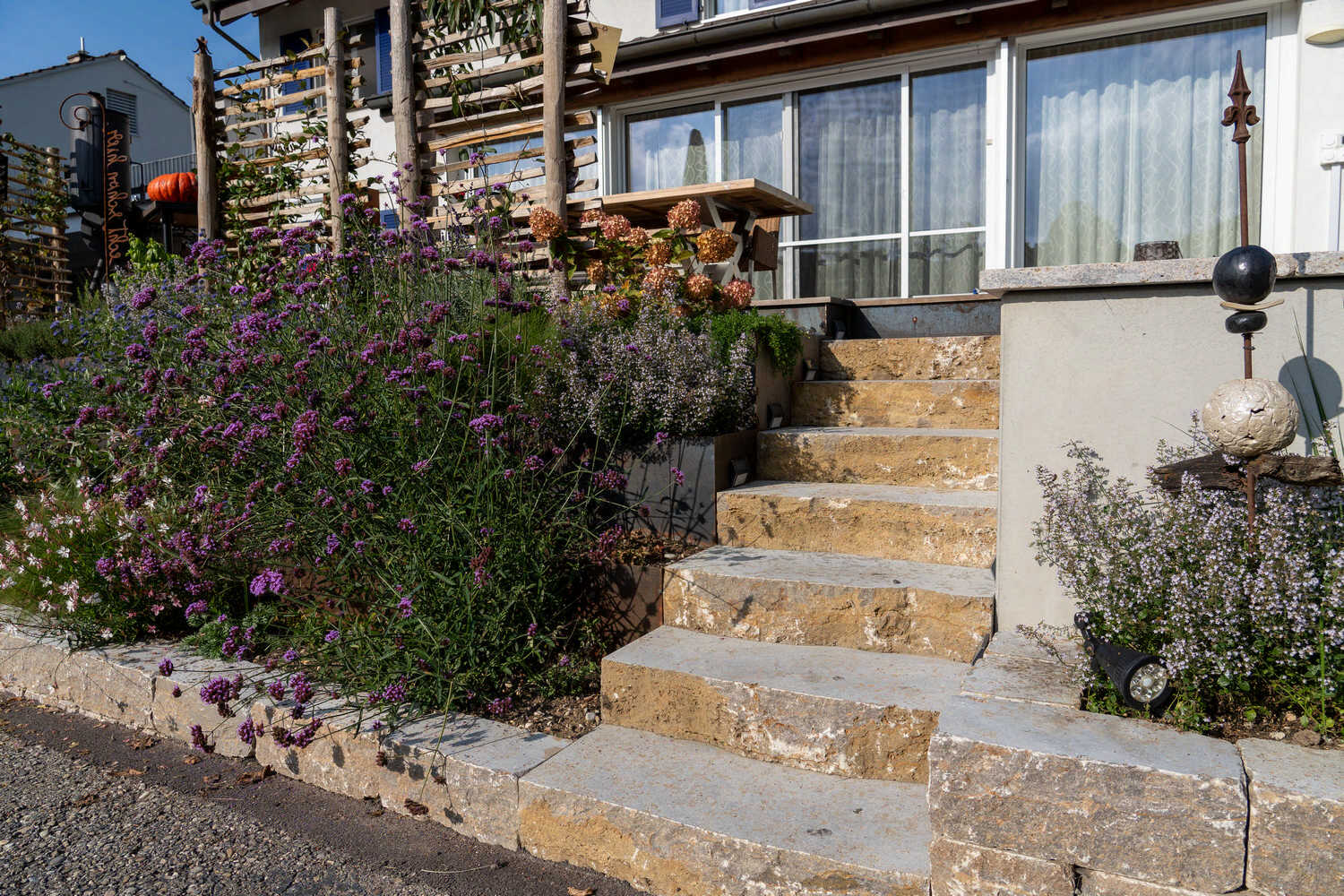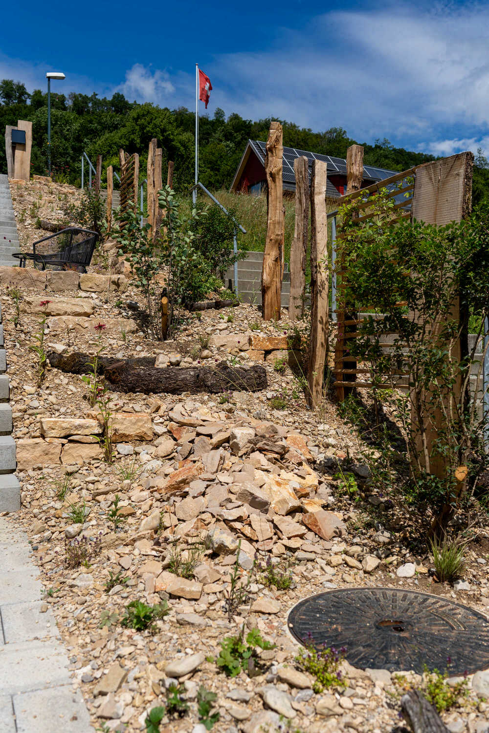 Den steilen Hang dieses Neubaus haben wir als wertvollen Trockenstandort ausgebildet. Mauersteine und Totholzelemente strukturieren die Böschungen, Sichtschutzelemente aus einfachen, teilweise begrünten Holzelementen schirmen den Garten etwas vom Fussweg ab und eine Trockenmauer bildet als besonderes Highlight die gemütliche Sitzecke. Die Bepflanzung des Trockenstandorts aus Gelbkies überzeugt mit Artenvielfalt und Blühfreude – und ist darüber hinaus noch äusserst pflegeleicht.