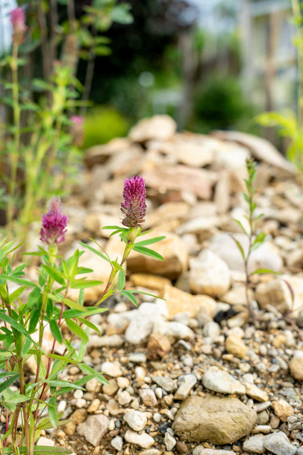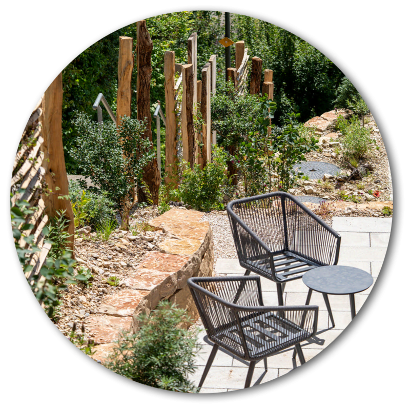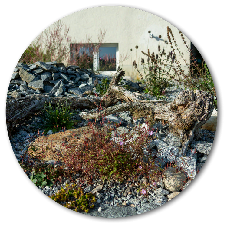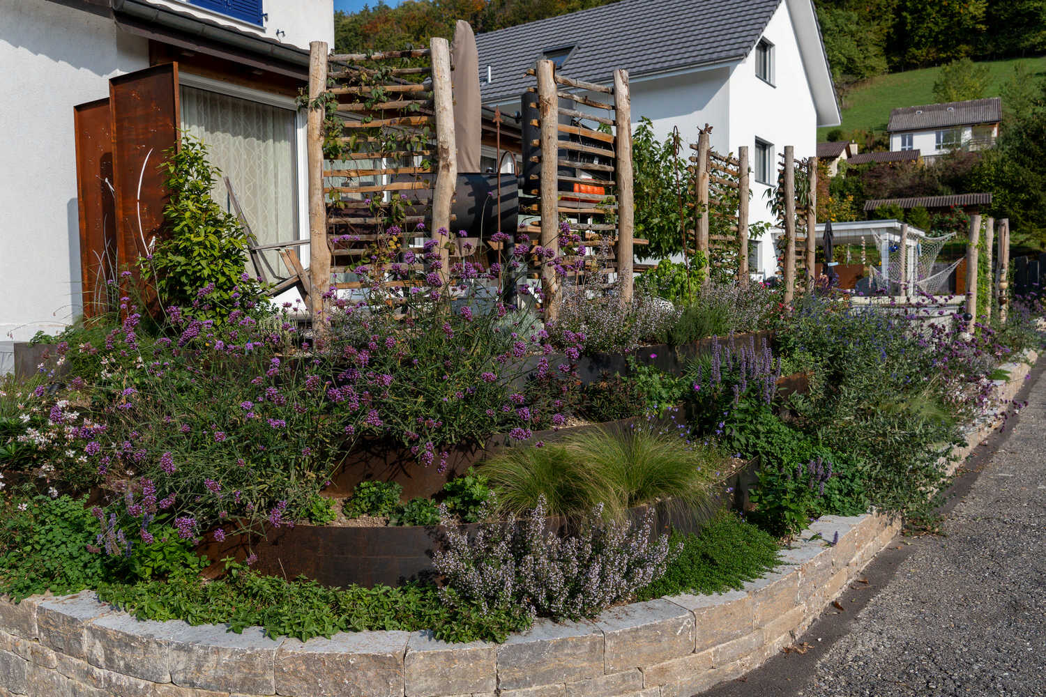 Den steilen Hang dieses Neubaus haben wir als wertvollen Trockenstandort ausgebildet. Mauersteine und Totholzelemente strukturieren die Böschungen, Sichtschutzelemente aus einfachen, teilweise begrünten Holzelementen schirmen den Garten etwas vom Fussweg ab und eine Trockenmauer bildet als besonderes Highlight die gemütliche Sitzecke. Die Bepflanzung des Trockenstandorts aus Gelbkies überzeugt mit Artenvielfalt und Blühfreude – und ist darüber hinaus noch äusserst pflegeleicht.
