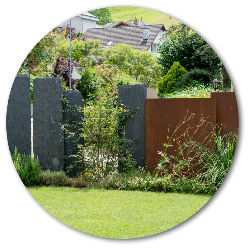 In einer spielerischen Mischung zwischen rohen Stahlwänden, Schieferstehlen und immergrünen Sträuchern entstand hier ein abwechslungsreicher und eleganter Sichtschutz zwischen dem Garten und der Quartierstrasse. Der Untergrund wurde mit Gelbkies ausgeblidet und grösstenteils mit wertvollen, einheimischen Wildstauden bepflanzt – ein spannender Futterplatz für viele Bienen und Schmetterlinge, aber zugleich auch eine pflegeleichte Lösung, welche die ansprechende Gesamtwirkung des Sichtschutzes noch erhöht.
