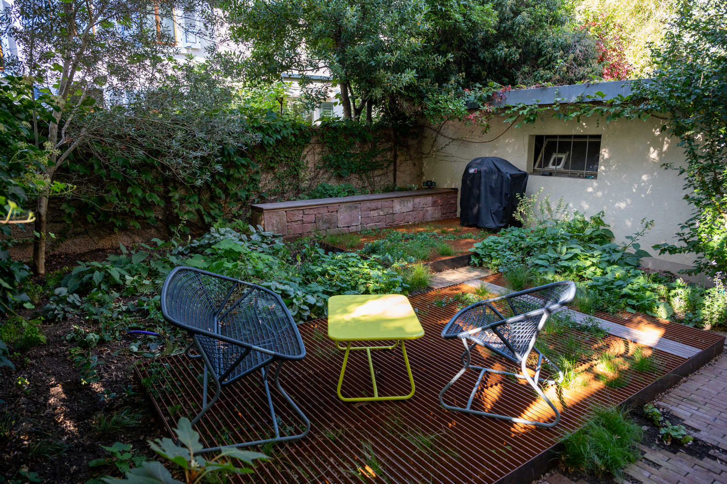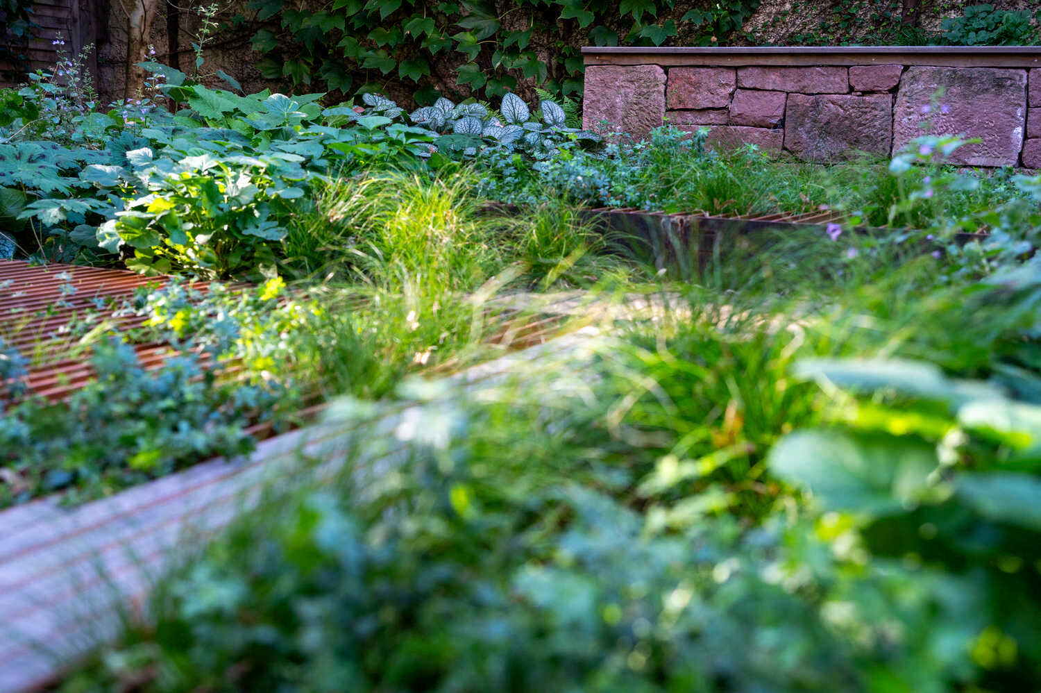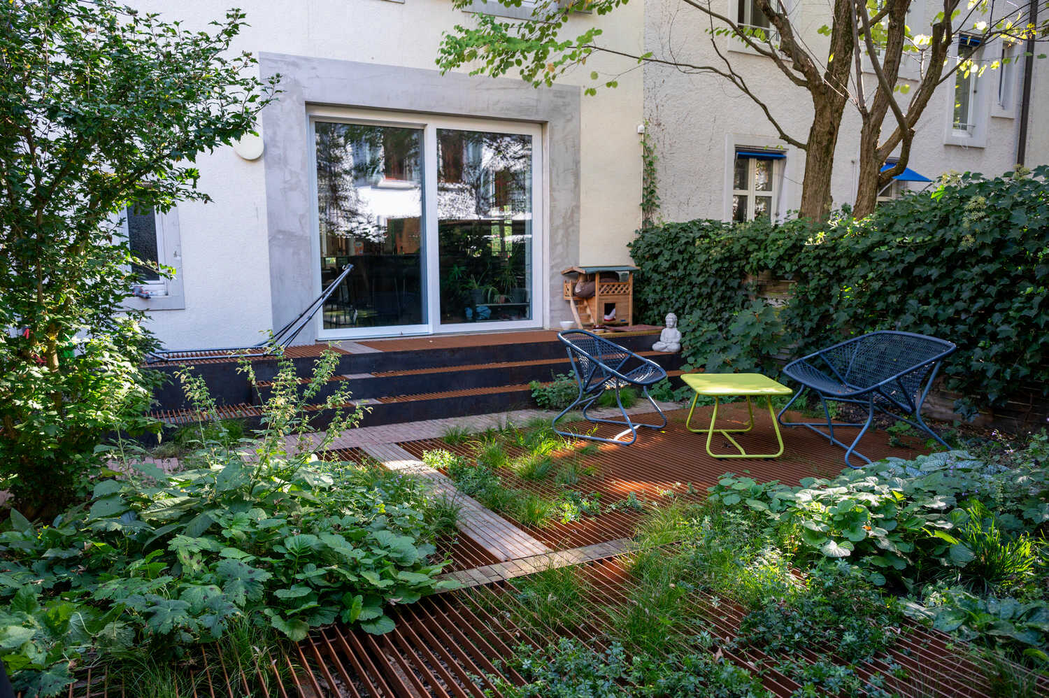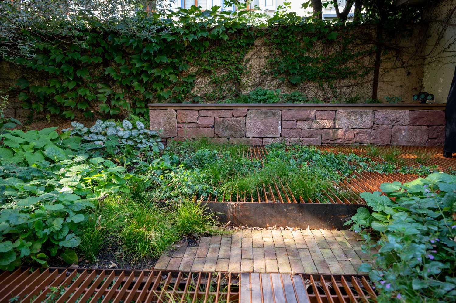 Schwebende Stahlplattformen sorgen in diesem Hinterhof für möglichst viel Grünfläche – dank der einfallsreichen Konstruktion wird nur ein minimaler Anteil des Bodens versiegelt. So können auch unter den Plattformen niedrigwachsende Stauden und Gräser wachsen. Rings um die beiden Plattformen sorgt eine texturreiche Schattenbepflanzung für Blütenpracht. Eine grosszügige Treppenkonstruktion im selben Stil überrückt die Höhendifferenz zwischen Wohnzimmer und Gartenbereich. Aus alten Sandsteinen, die vom Innenausbau der Wohnung als Restposten anfielen, konnte eine wunderbare Sitzmauer entstehen.