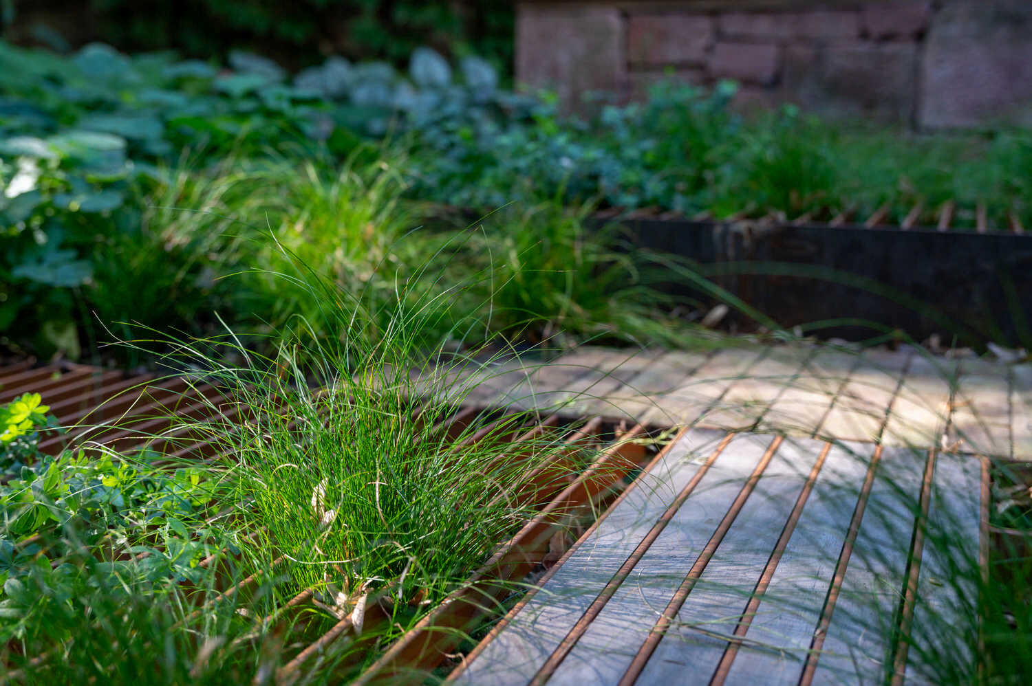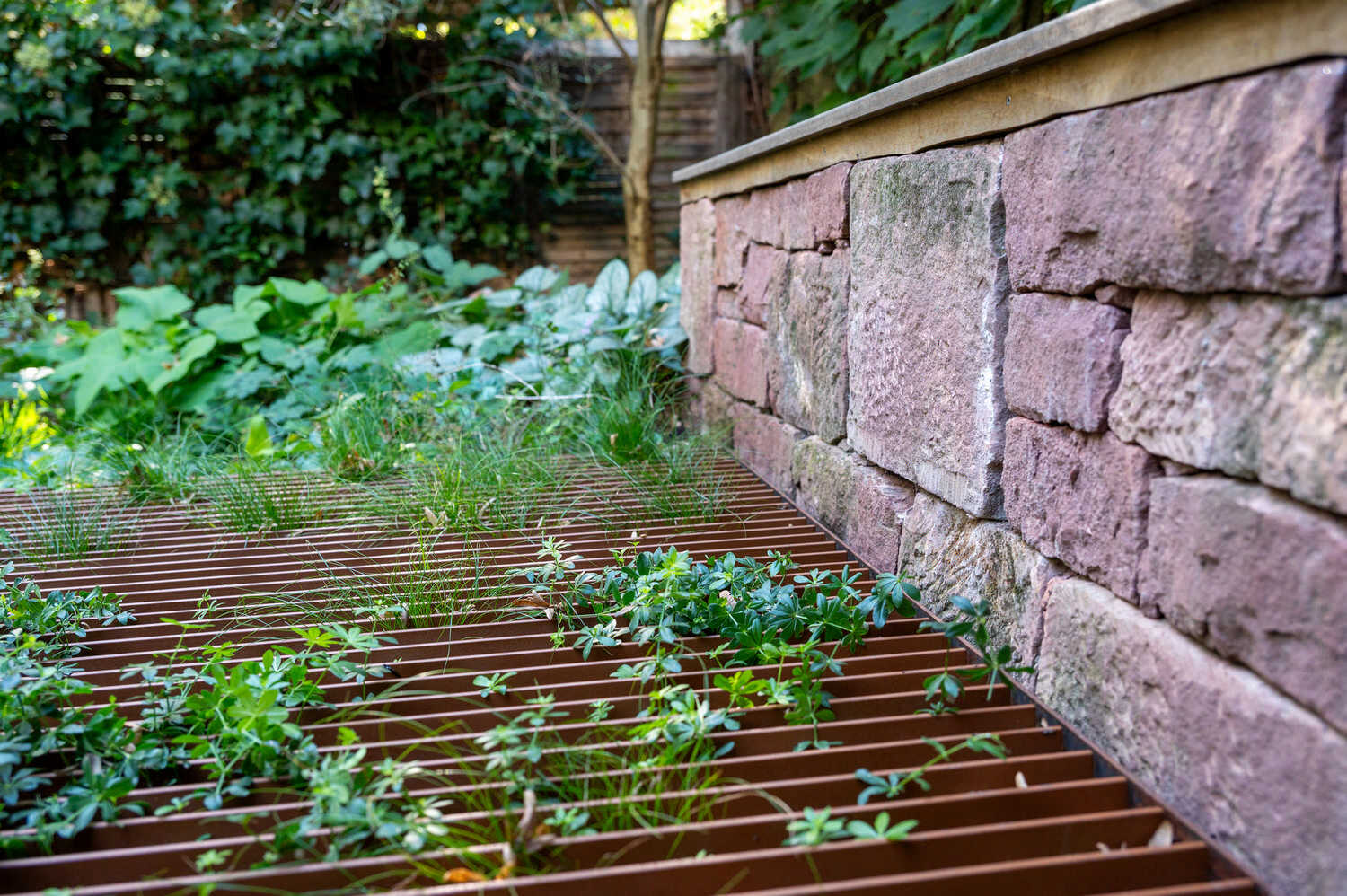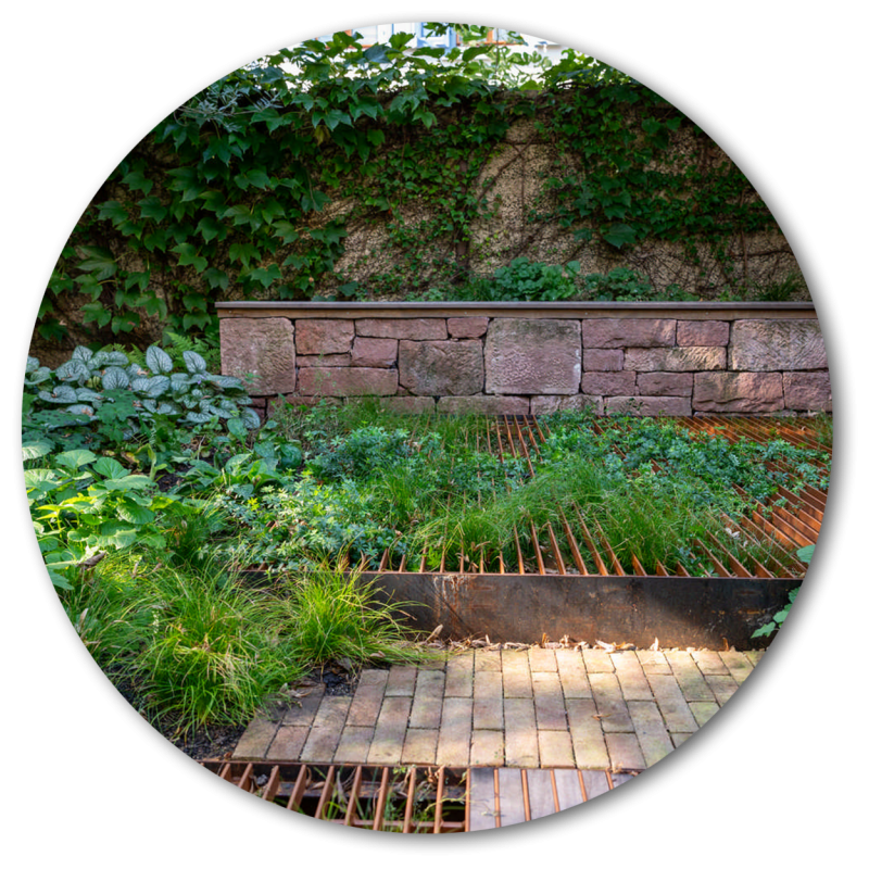 Schwebende Stahlplattformen sorgen in diesem Hinterhof für möglichst viel Grünfläche – dank der einfallsreichen Konstruktion wird nur ein minimaler Anteil des Bodens versiegelt. So können auch unter den Plattformen niedrigwachsende Stauden und Gräser wachsen. Rings um die beiden Plattformen sorgt eine texturreiche Schattenbepflanzung für Blütenpracht. Eine grosszügige Treppenkonstruktion im selben Stil überrückt die Höhendifferenz zwischen Wohnzimmer und Gartenbereich. Aus alten Sandsteinen, die vom Innenausbau der Wohnung als Restposten anfielen, konnte eine wunderbare Sitzmauer entstehen.