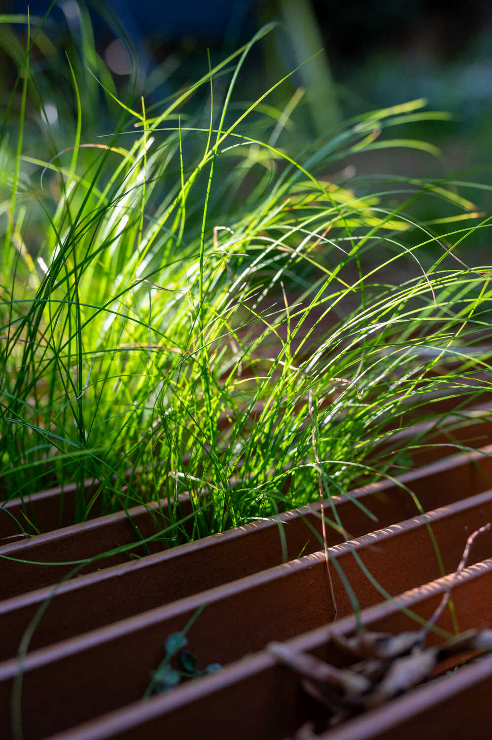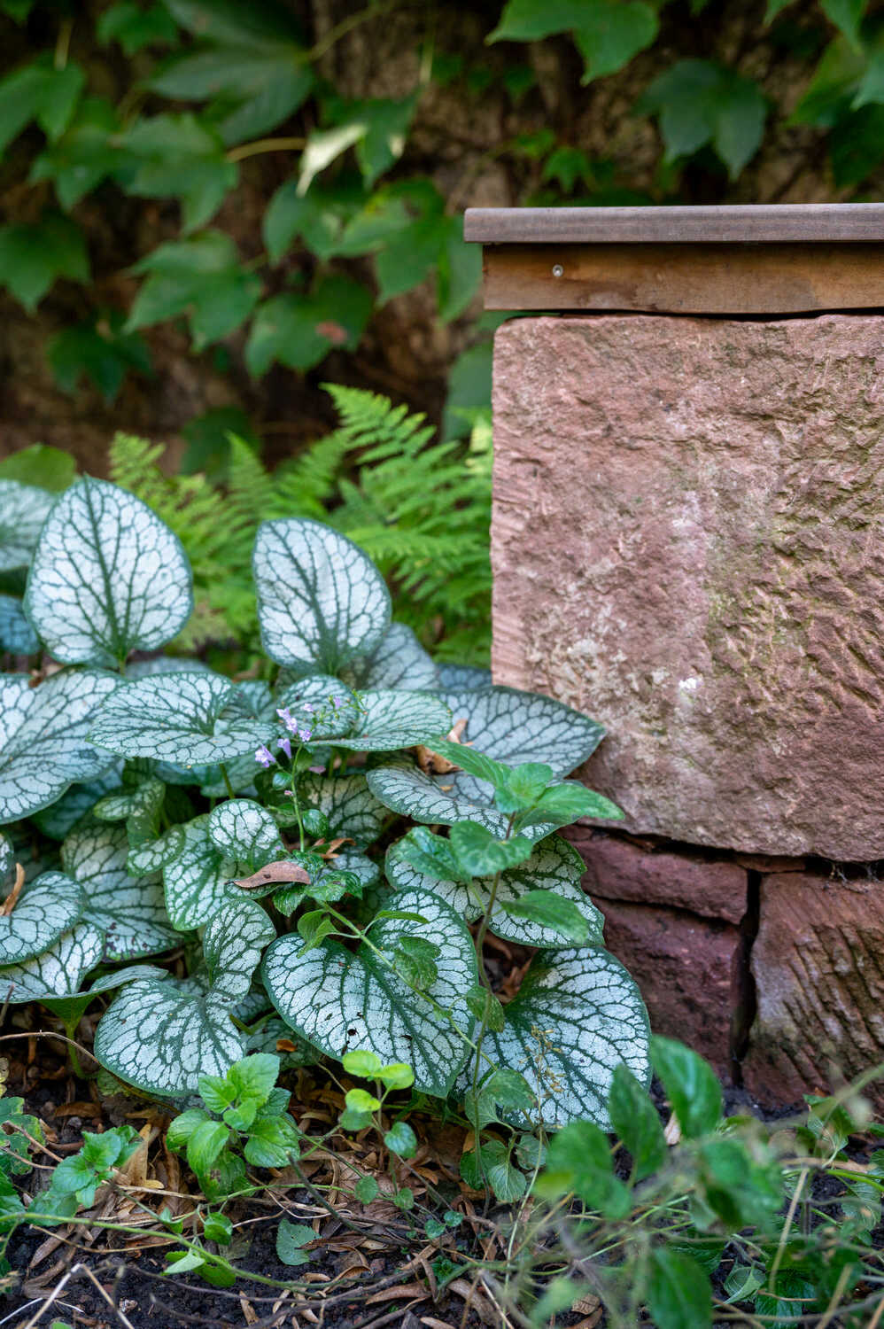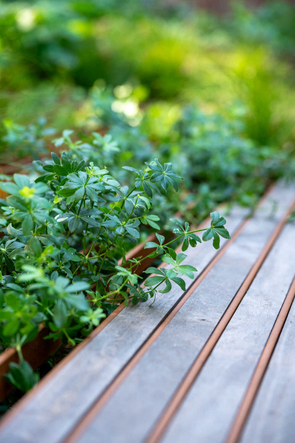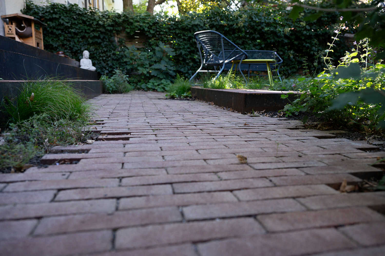 Schwebende Stahlplattformen sorgen in diesem Hinterhof für möglichst viel Grünfläche – dank der einfallsreichen Konstruktion wird nur ein minimaler Anteil des Bodens versiegelt. So können auch unter den Plattformen niedrigwachsende Stauden und Gräser wachsen. Rings um die beiden Plattformen sorgt eine texturreiche Schattenbepflanzung für Blütenpracht. Eine grosszügige Treppenkonstruktion im selben Stil überrückt die Höhendifferenz zwischen Wohnzimmer und Gartenbereich. Aus alten Sandsteinen, die vom Innenausbau der Wohnung als Restposten anfielen, konnte eine wunderbare Sitzmauer entstehen.