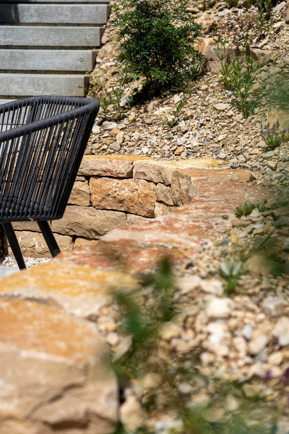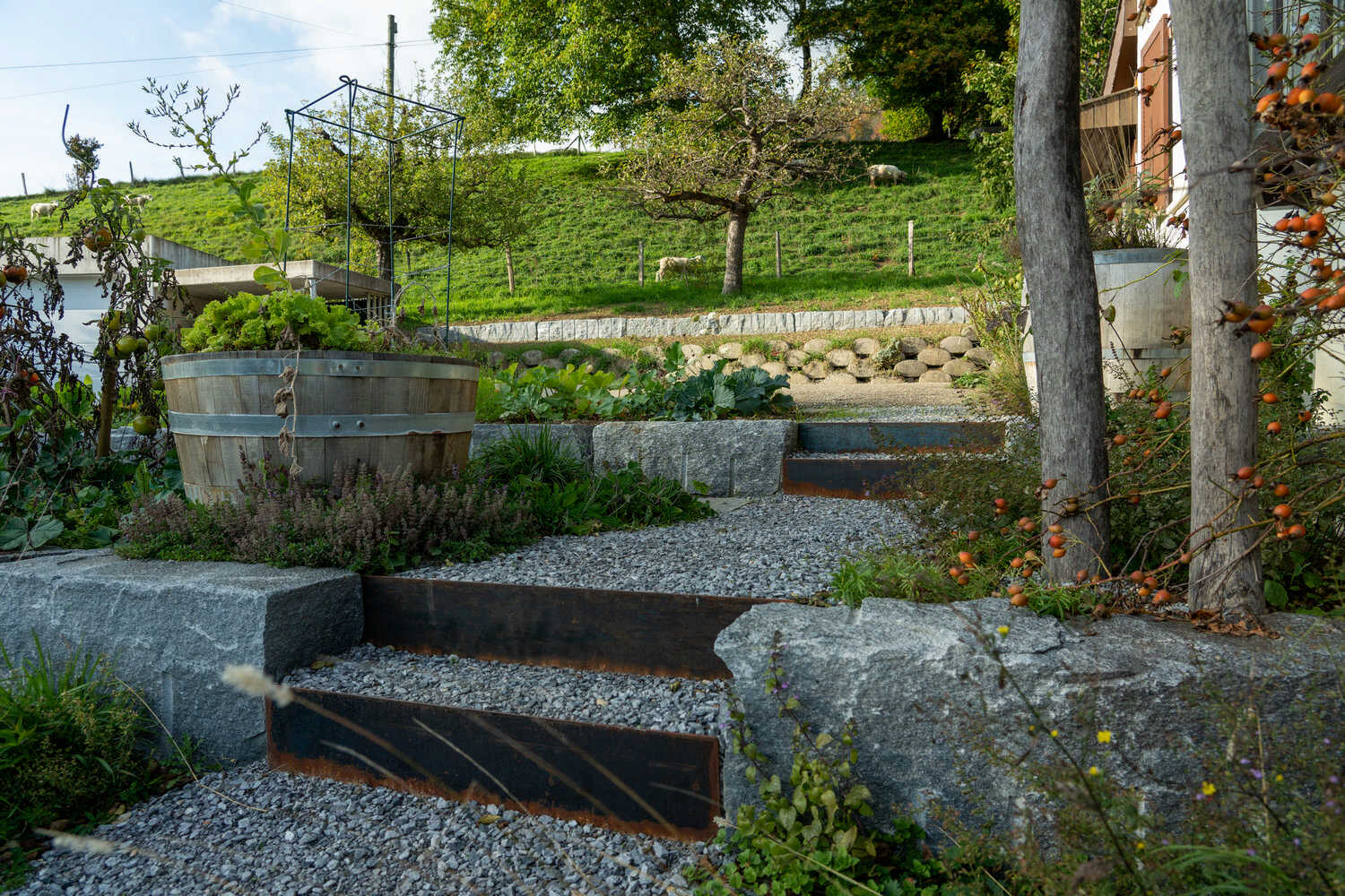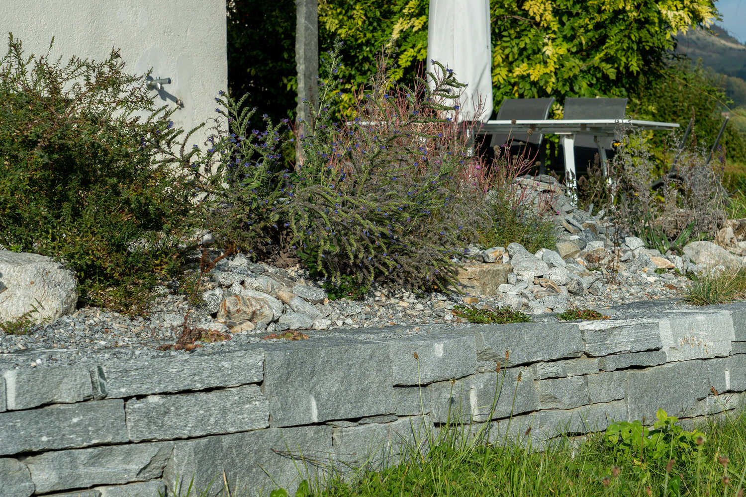 Mit hochwertigem Tessiner Naturstein haben wir diesen Garten neu gegliedert. Steinreihen terrassieren den neuen Gemüsegarten, Trockenmauern bieten neue Sitzmöglichkeiten. Gemütliche Sitzplätze mit polygonalen Granitplatten, geschwungene Kieswege durch den neuen Garten, der antike Natursteinbrunnen aus dem Burgund sowie die artenreiche Bepflanzung von Rabatten und Trockenstandorten mit einheimischen Wildstauden sorgen für einen vielseitig nutzbaren, erweiterten Wohnraum und einen strukturreichen Lebensraum.