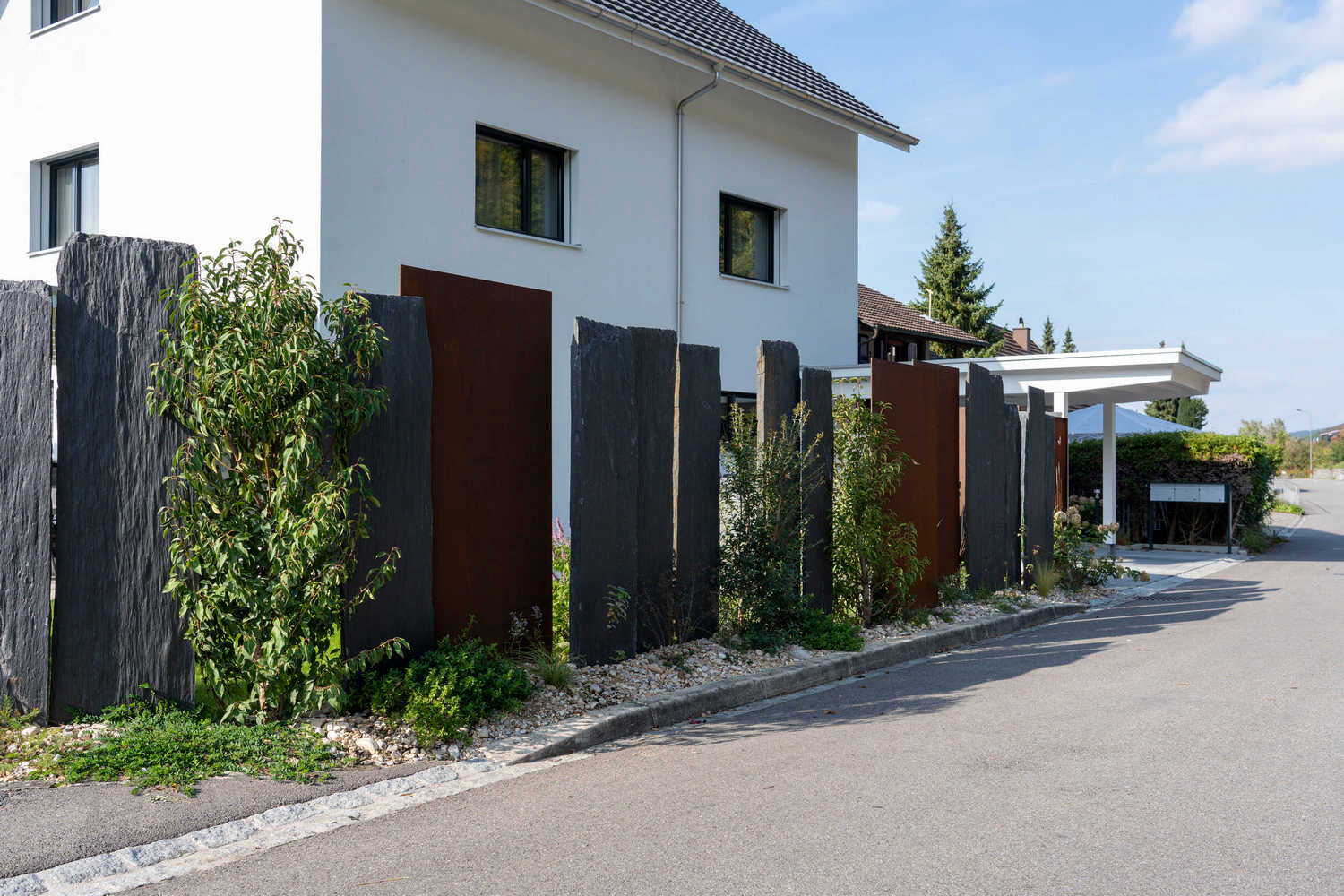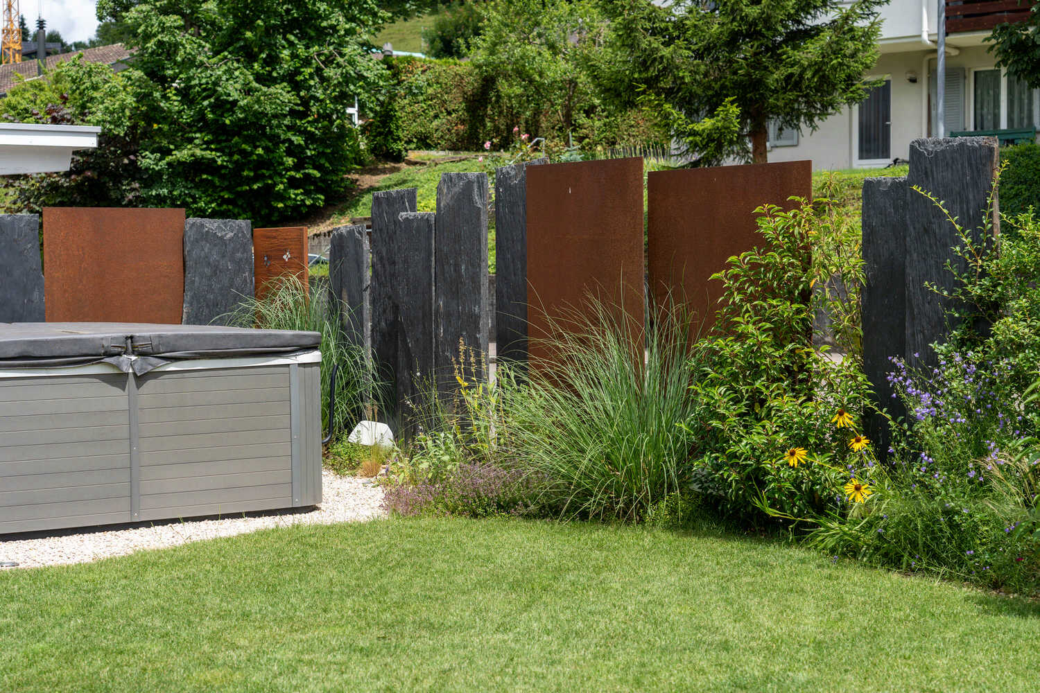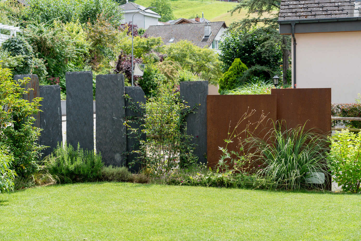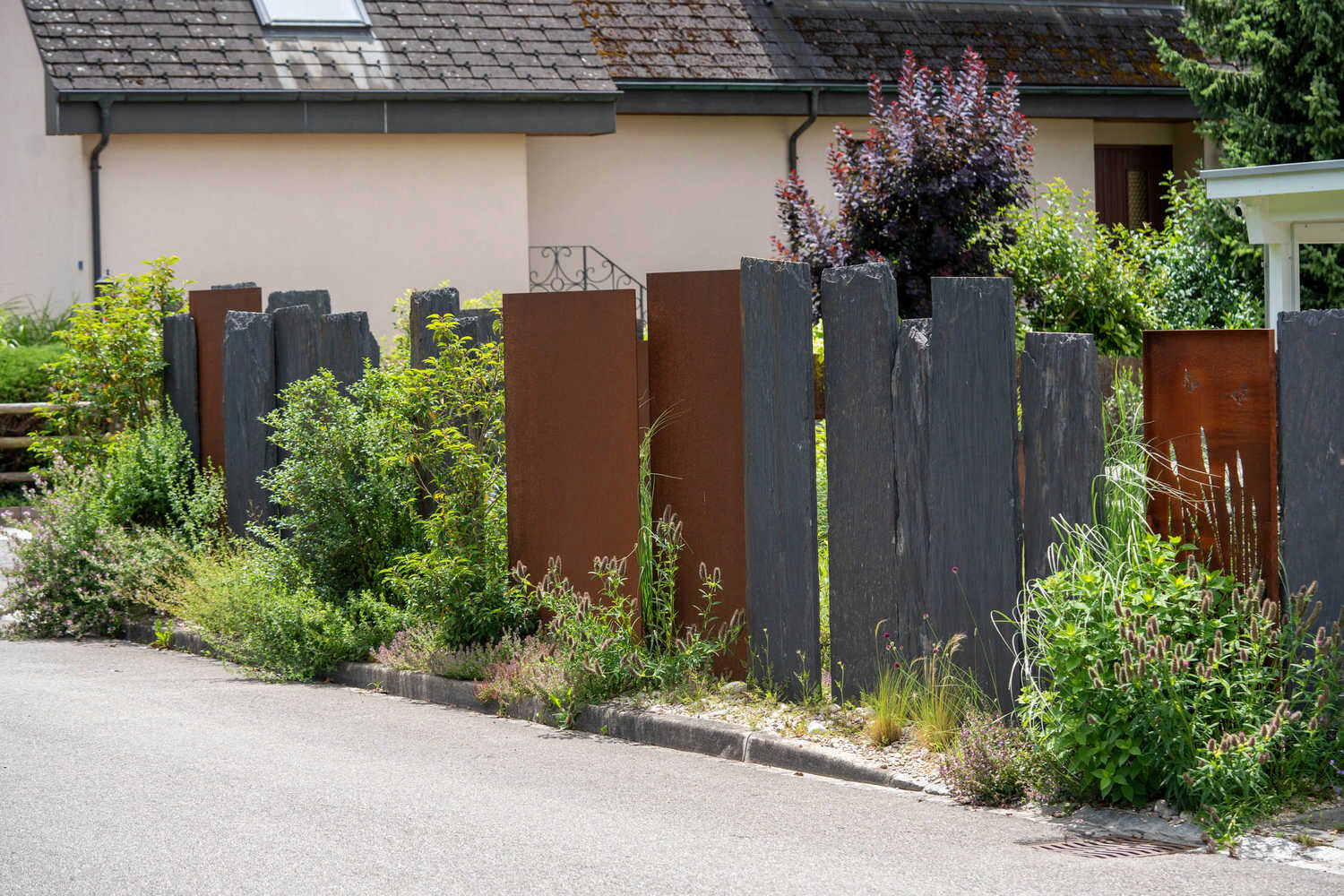 Abwechslungsreicher Sichtschutz aus Stahl, Schiefer und Bepflanzung