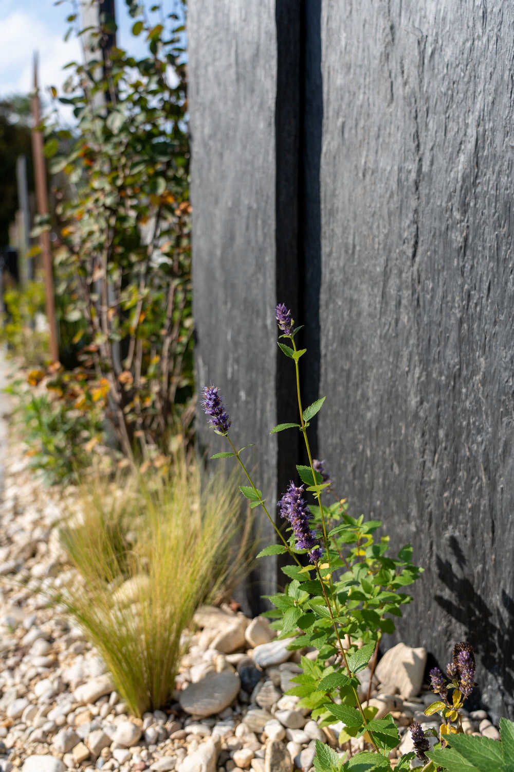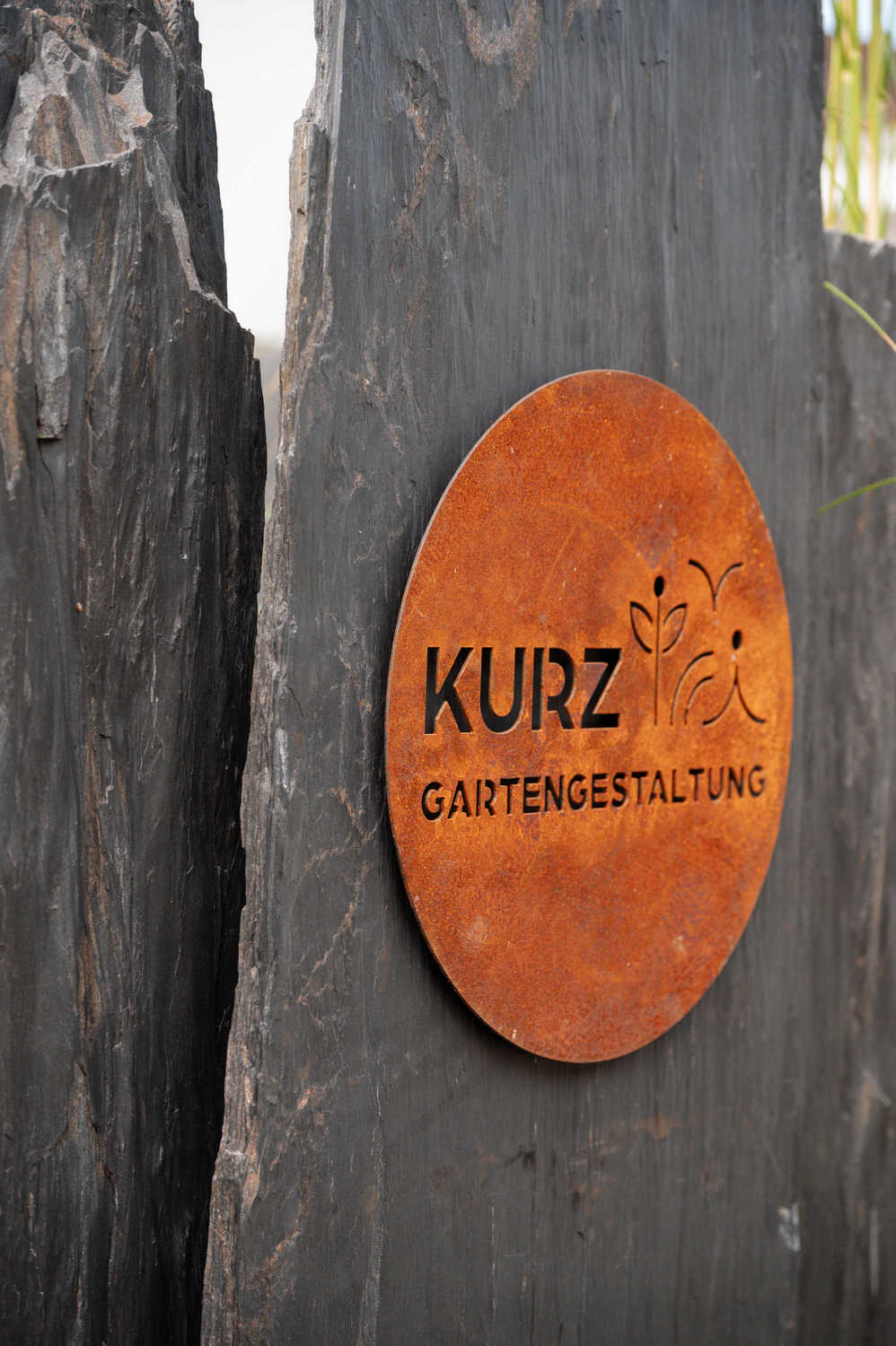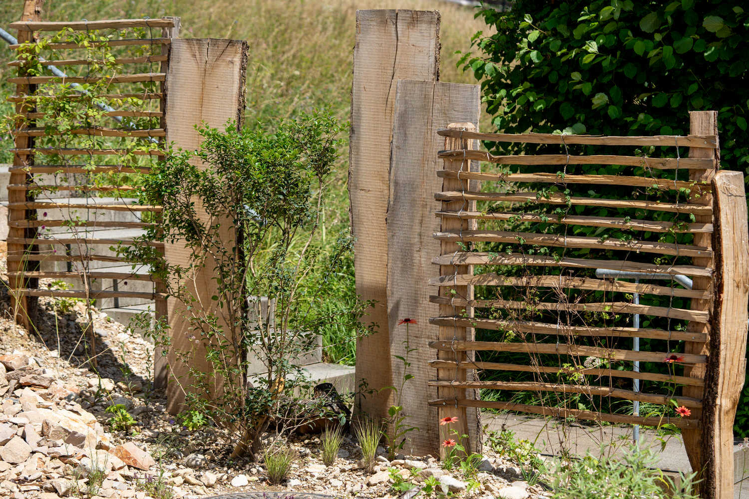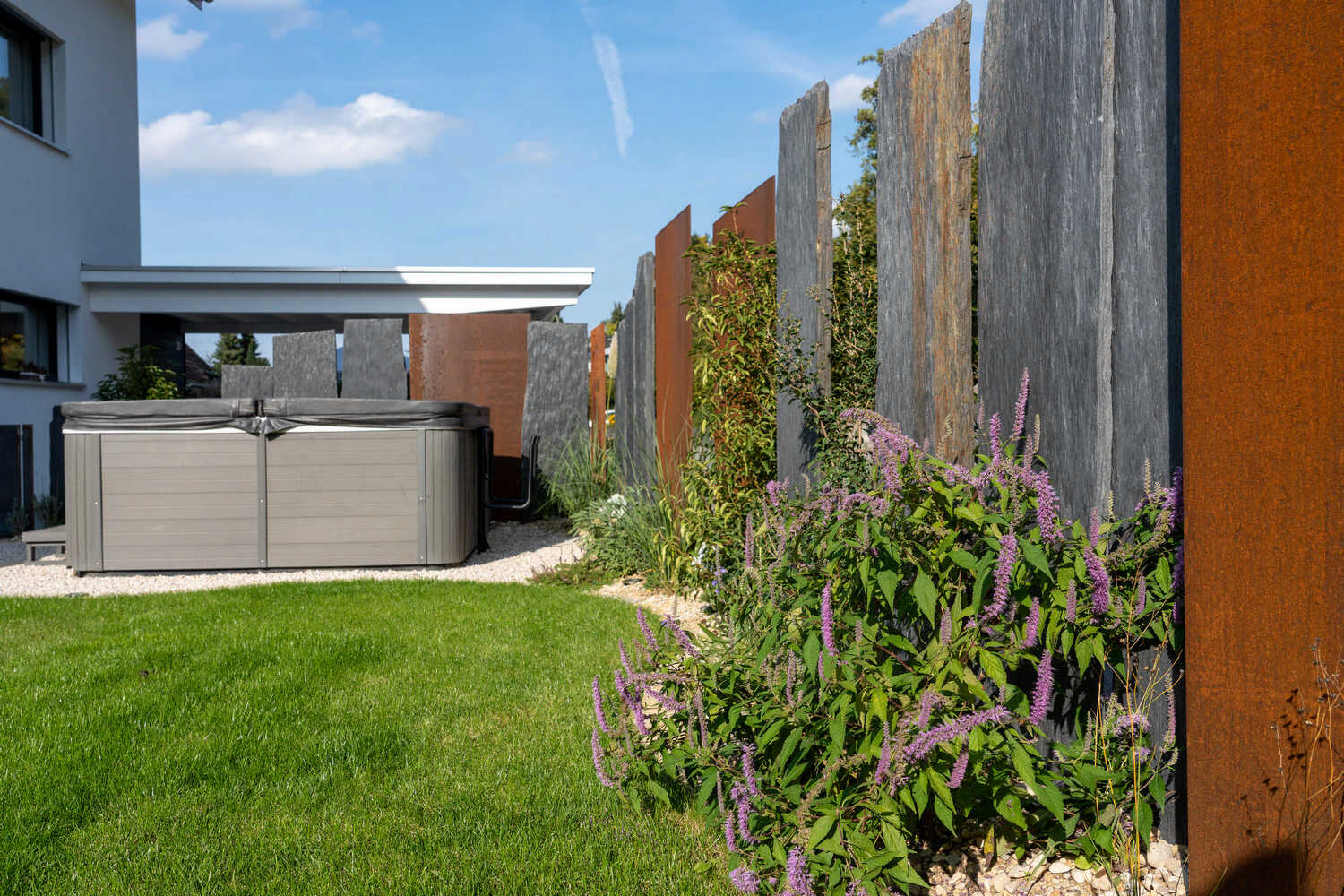 Abwechslungsreicher Sichtschutz aus Stahl, Schiefer und Bepflanzung