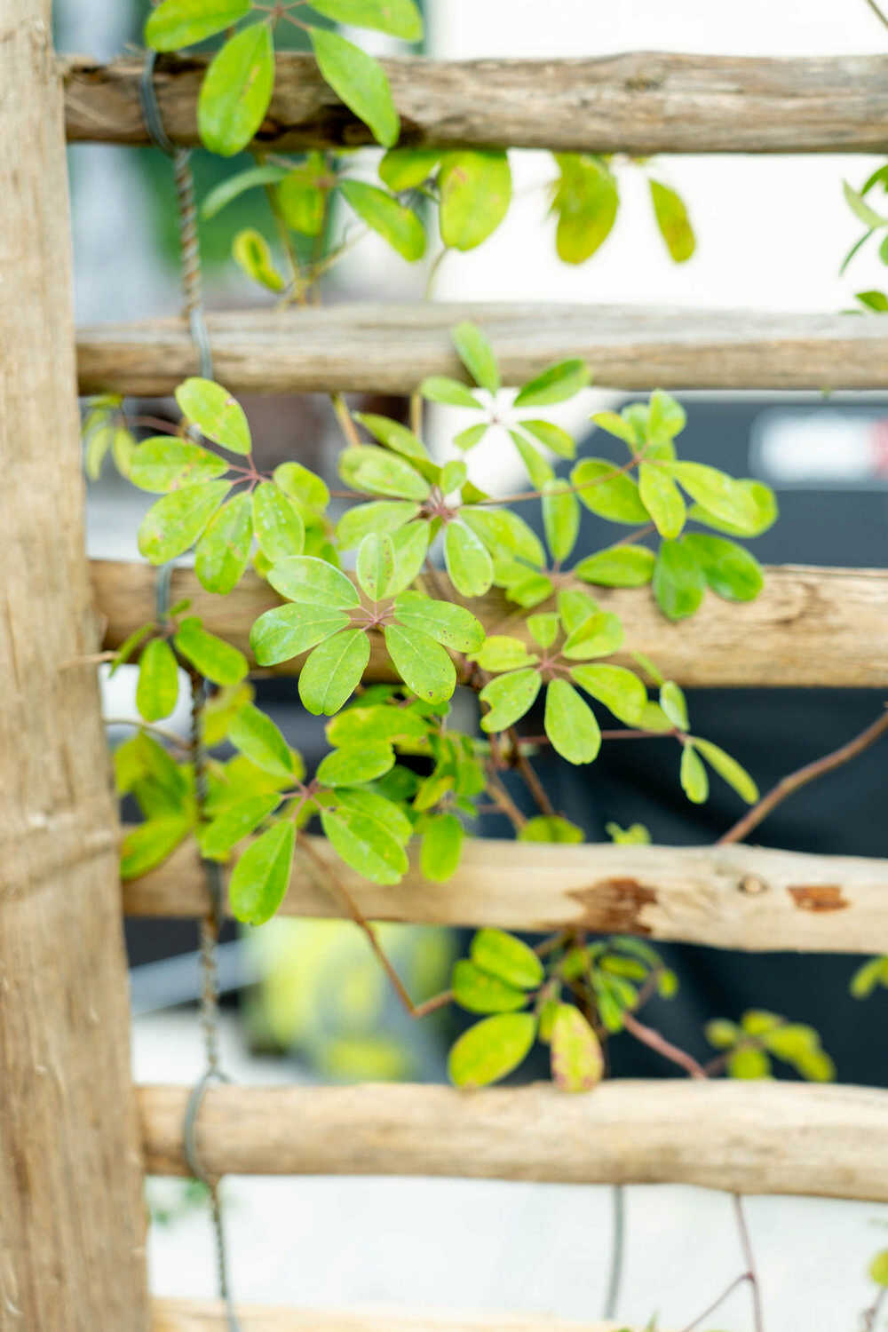 Schwebende Stahlplattformen und viel Grün im Hinterhof